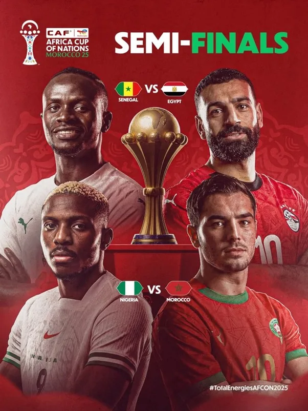 Africa’s premier football tournament, the 35th TotalEnergies CAF Africa Cup of Nations Morocco 2025, is set to enter its most thrilling stage today as four of the continent’s top teams will battle it out in the semi-finals.